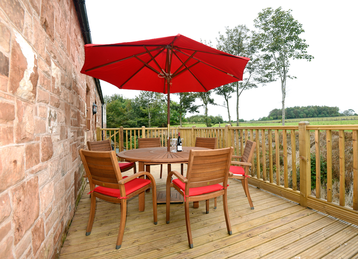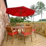 Large decking area with access from lounge with garden furniture for six, gas barbeque and private outdoor hot tub. Guests relaxing in the hot tub can enjoy views overlooking the stream which runs down from the original water wheel house and the surrounding fields and woodlands.