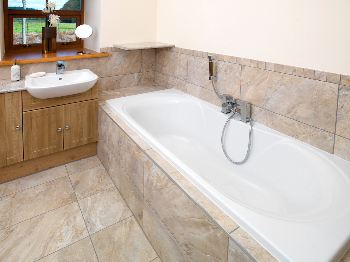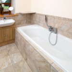 Double ended bath with shower head, large walk-in shower with rainforest and second shower head, WC & basin. Non-slip tiles with underfloor heating.